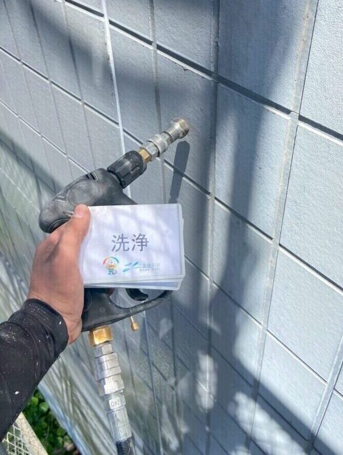 外壁塗装前に、外壁に付着している汚れや旧塗膜、埃、カビ等を高圧洗浄機を用いて洗浄します。