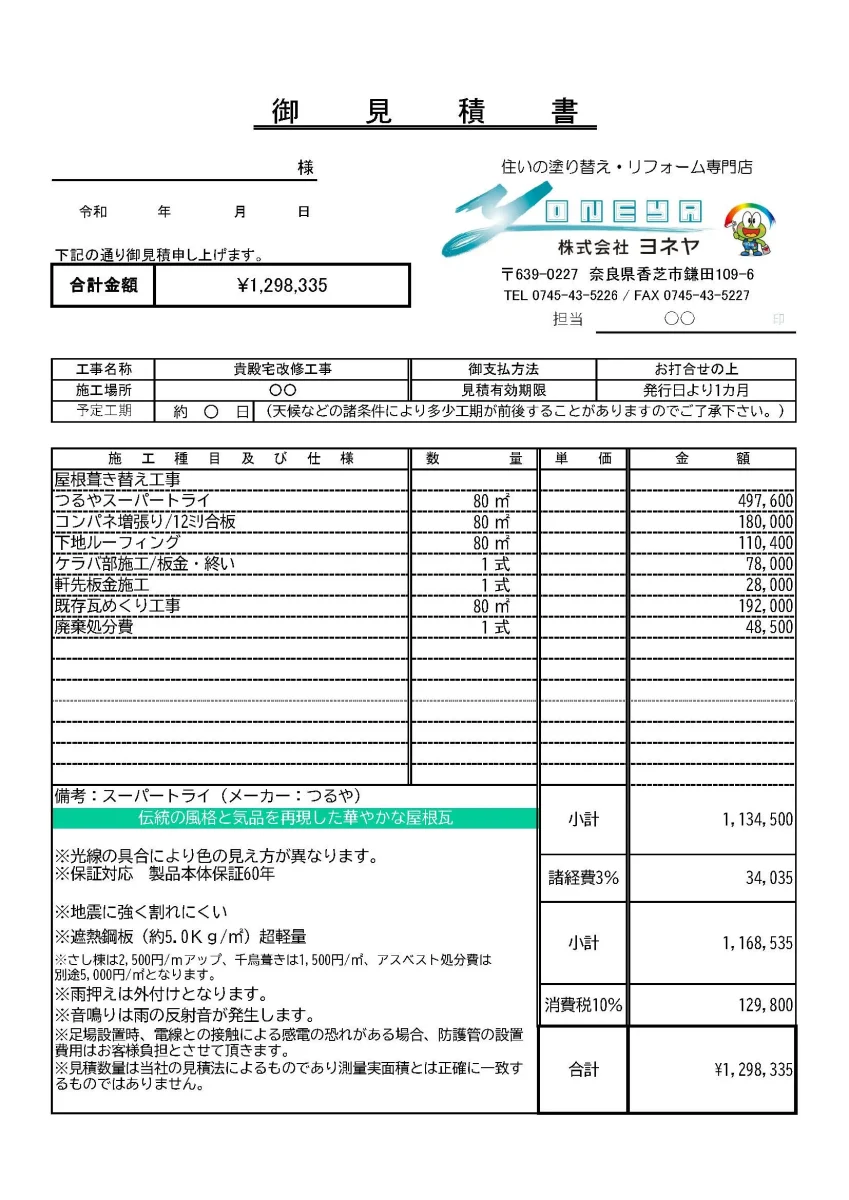 ヨネヤではお客様に心から納得して頂くために見積書を作成するだけでなく、その内訳を丁寧にご説明いたします。