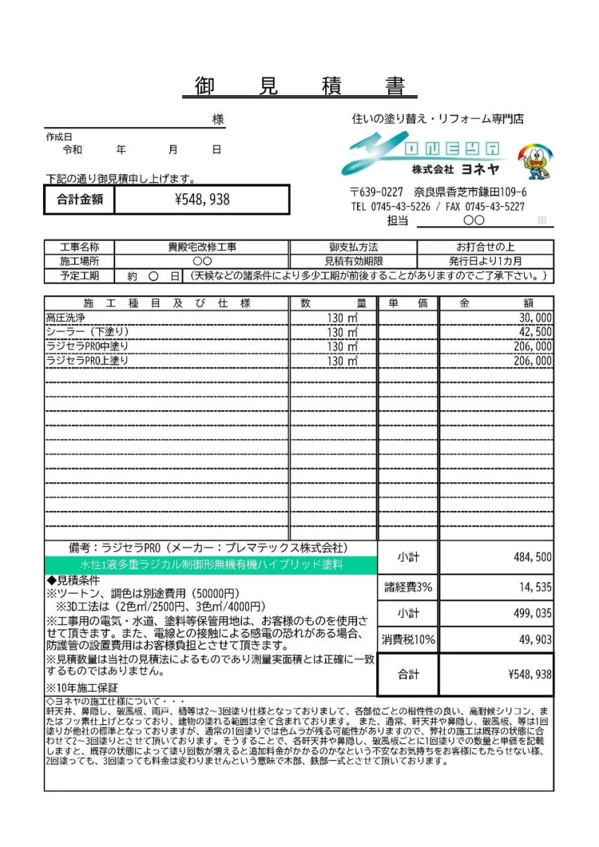 塗装専門店のヨネヤではお客様に心から納得して頂くために見積書を作成するだけでなく、その内訳を丁寧にご説明いたします。